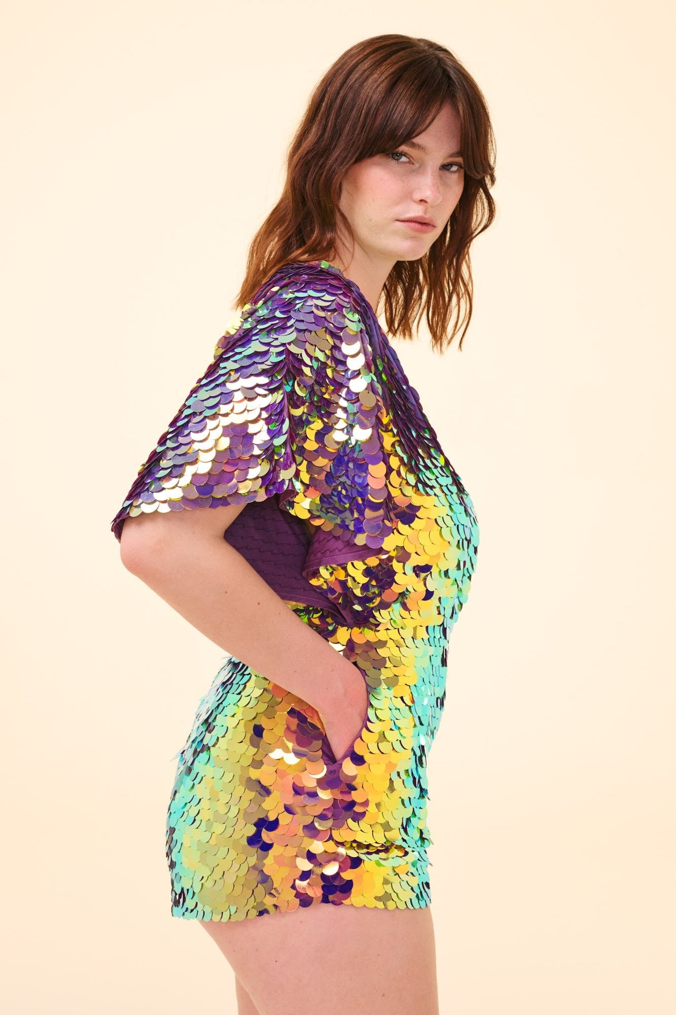 Behold the Mella, with her commanding cape sleeves and acres of iridescent disc sequins. This sequin romper will give you a striking silhouette, yet is easy and comfortable to wear thanks to the organic cotton fabric and carefully designed fit.