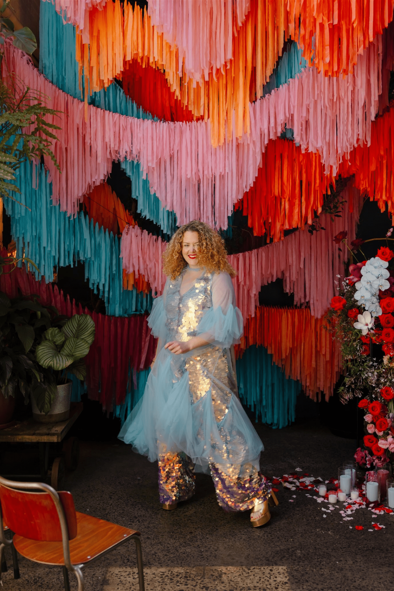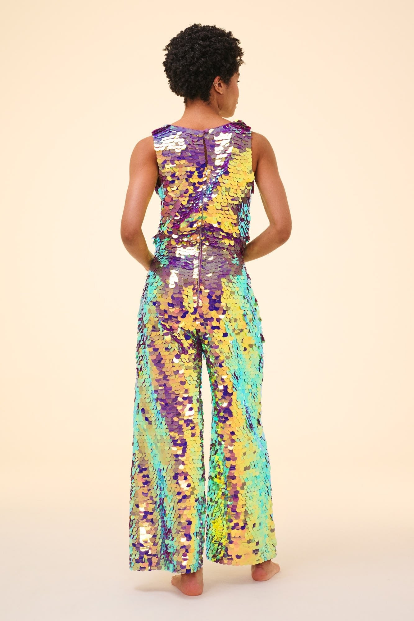 Serotonin in jumpsuit form. Wide legs, a nipped-in waist, and thousands of hand-stitched sequins adorn every inch.