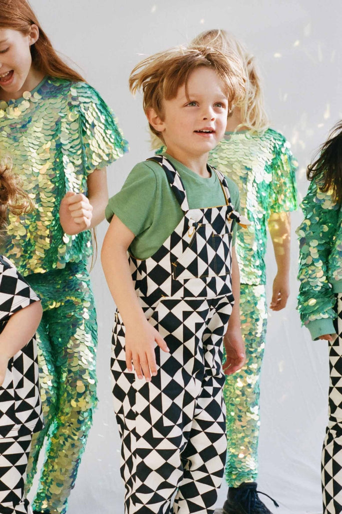 Tri print’s geometric black and white design comes from a painting done by Rosa’s grandfather in the 1980s. It is hand screen-printed onto the softest stretch cotton jersey. We love to mix and match this print with our sequin pieces.