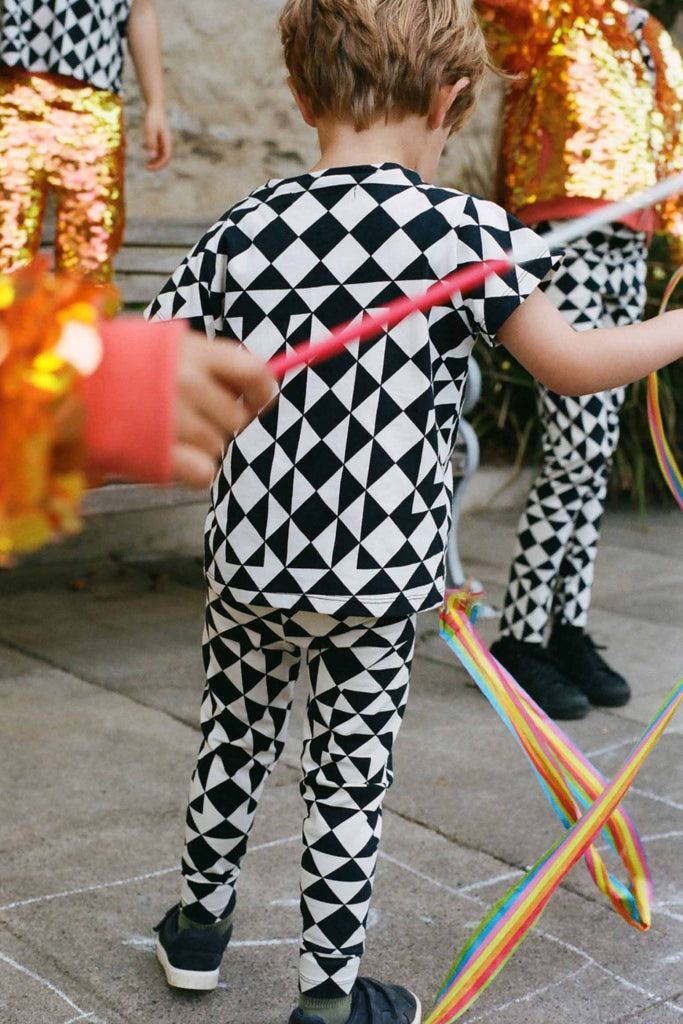 Our first ever children's T-shirt. Featuring our trademark bold graphic Tri print. We love co-ordinating this printed T-shirt with our sequin childrenswear.