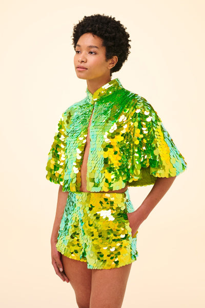 This sequin cape gives you a striking silhouette. The stand-up collar and graduated sequins are compelling design features. It will make you feel like a queen.