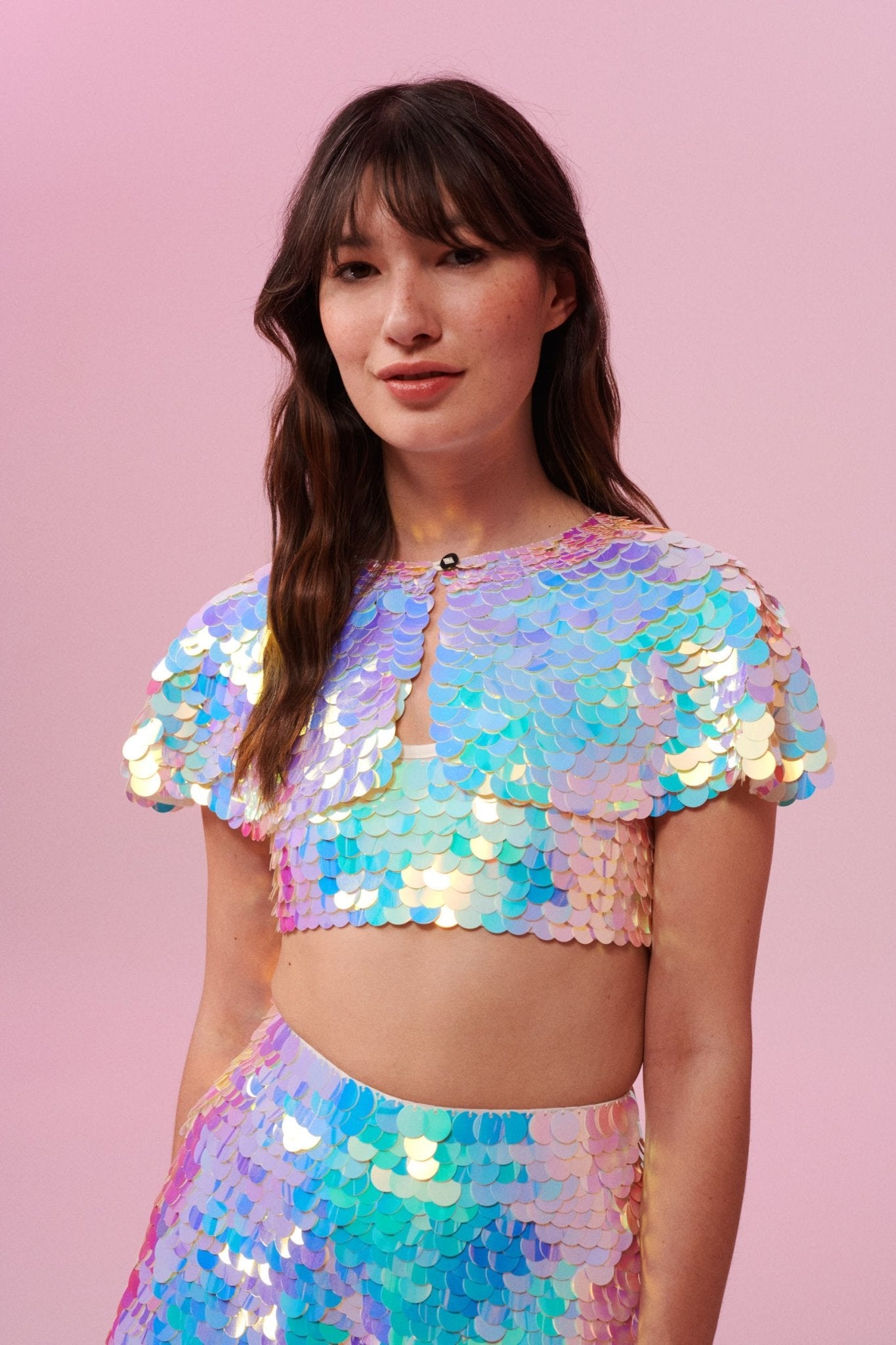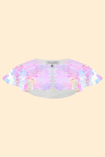 Our sequin cape sits neatly over your shoulders and adds a sparkling accent to any outfit. Rows of tiny sequins at the neck add a special detail.