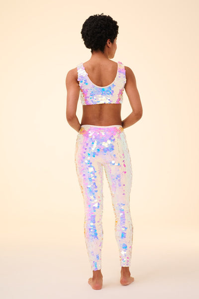 Our sequin leggings deliver unparalleled sparkle. They will swathe your legs with thousands of iridescent sequins, all hand-stitched onto a comfortable stretchy cotton fabric. Plus, they’re unisex.