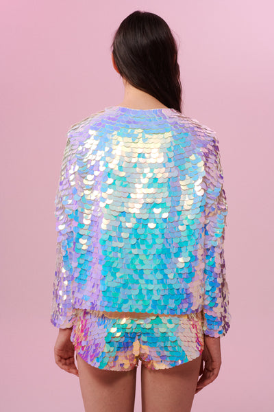 Our classic offering for your shoulders: the perfect boxy jacket. Covered with our trademark iridescent sequins. Your new favourite layering piece.